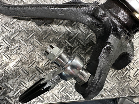 Alignment settings with high castor and camber values create steering geometry that induces toe-in of the front wheels as the suspension compresses. This is what is commonly referred to as bump-steer, This is a bad thing because it reduces grip. I have developed this adjustable tie rod kit to solve this problem. This kit is designed to allow the height of the tie rod end to be adjusted to correct for the drop in height caused by inclining the knuckle for greater camber and castor.
