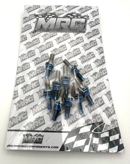 Clean up your engine bay and shed some weight with MRC Racing Components Titanium intake/exhaust stud kit! This kit is Burnt Blue Titanium in color. This is sold as a kit and includes 10- 45mm Titanium Studs 10- Titanium Washers 10- 12pt Titanium Nuts |