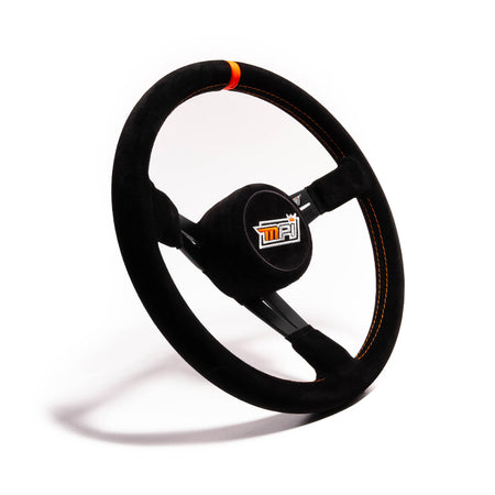 Steering Wheel - Bandolero / Legends - 13.75 in Diameter - 3.5 in Dish - 3-Spoke - Black Suede Grip - Orange Stripe - Aluminum - Black Anodized - Each
