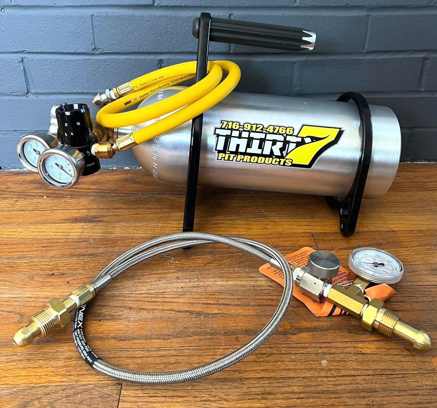 Portable aluminum nitrogen air tank that is perfect for making those last minute adjustments at the track or on the go! This kit comes with regulator, hose with air chuck, tank, transfer hose with air bleeder, tank brackets and handle.